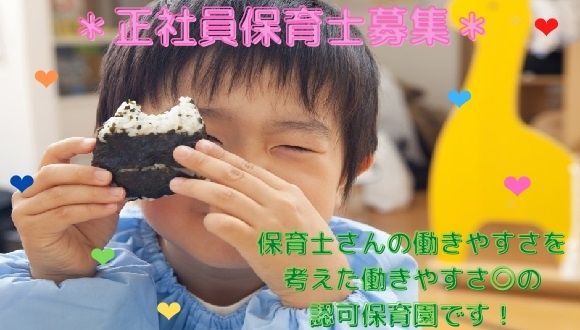 定員60名の認可保育園 0~5歳児の保育業務 ・食事の補助 ・遊びの見守り ・身の回りのお世話 ・書類の作成 早番6:45から11:45 1日5H 週5日勤務 朝の合同保育や 各クラスのサポートお願いします! 残業や持ち帰りは一切ありません♪ |